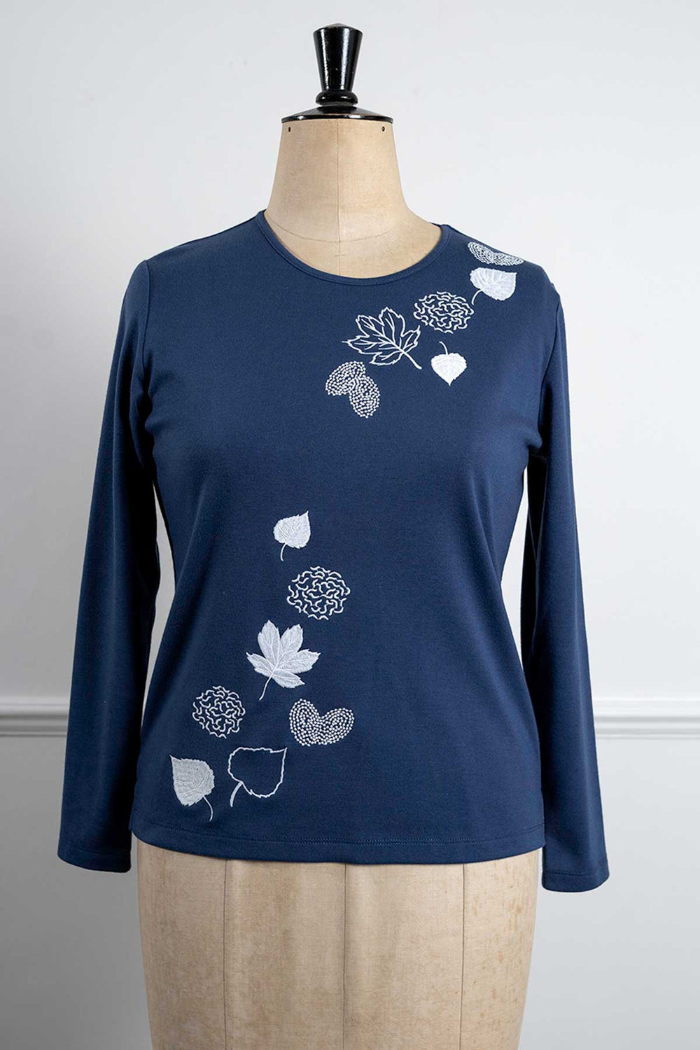 Beautifully designed jersey top featuring feminine contrasting embroidery. Styled with long length sleeves and a classic round neckline, can be worn separately or perfectly coordinates with the Autumn Leaves Print Skirt. Machine washable. 65% polyester, 35% cotton. Back length from 23".