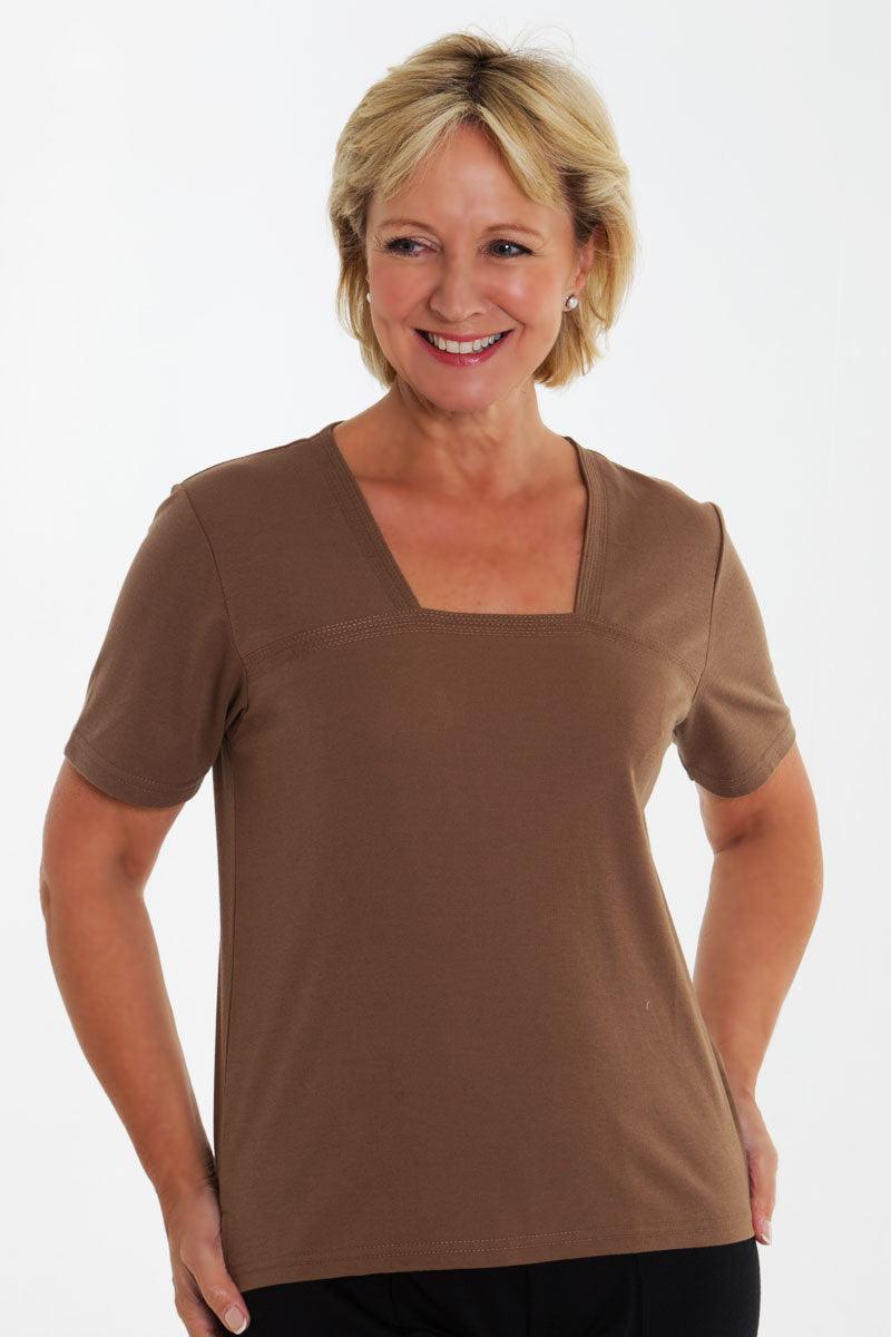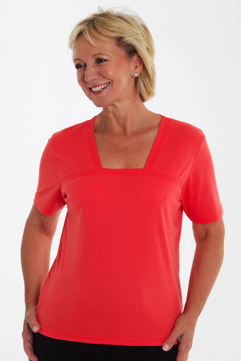 A versatile wardrobe staple, this plain square neck T shirt features a decorative top stitch seam. Machine washable. 65% polyester, 35% cotton. Made by Poppy.