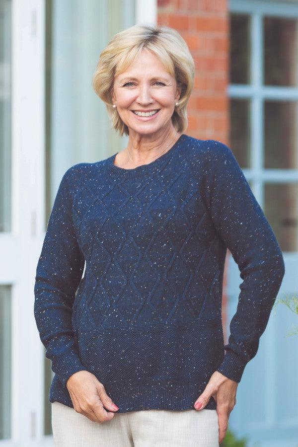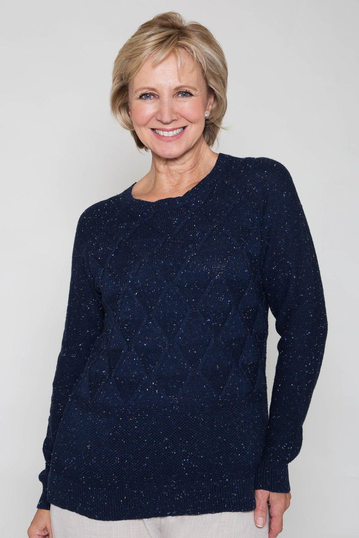 Ultra-chic, flecked slub yarn jumper by Poppy. Featuring boat neckline, raglan sleeve and diamond cable front. Super soft, a guaranteed favourite from our new Spring range. Can be worn underneath the matching Diamond Cable Cardigan (JP241). Back length from 24 inch. Machine washable. 100% cotton.