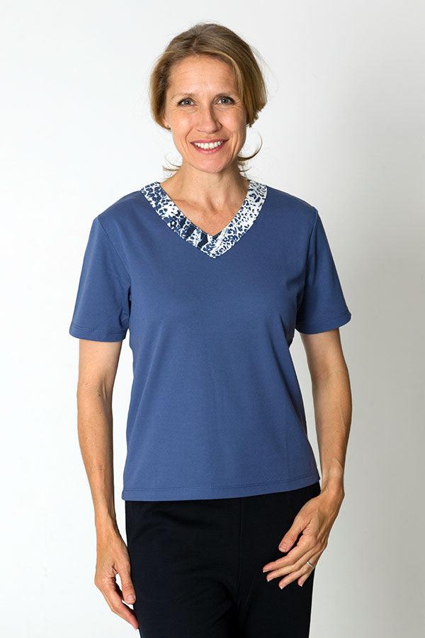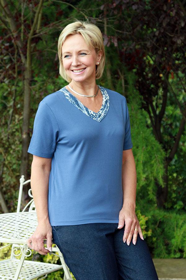 Abstract print inset Vee neckline t-shirt by Poppy. Machine washable. Made from easy care jersey.