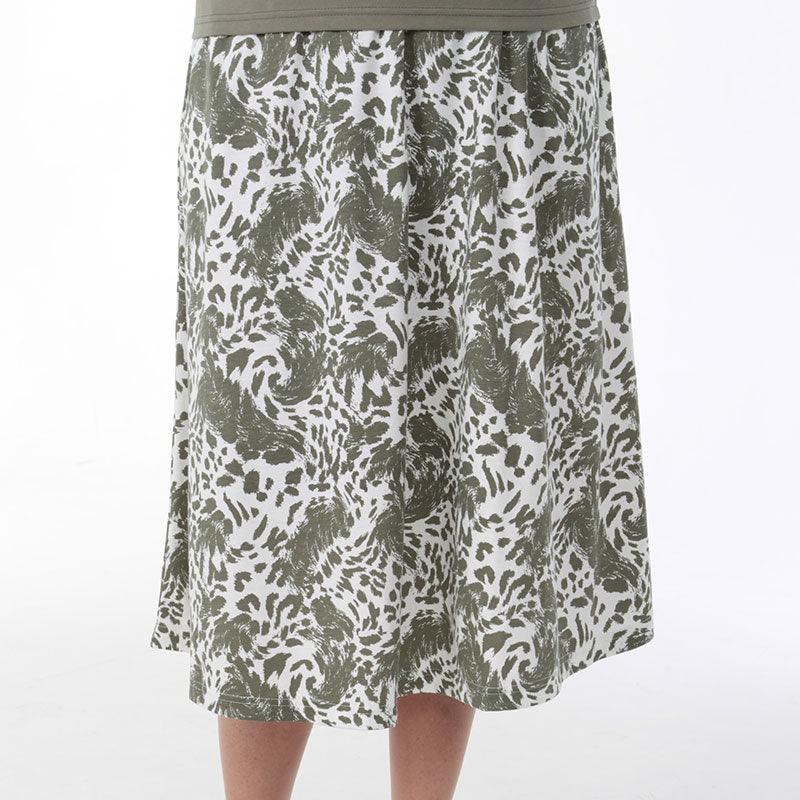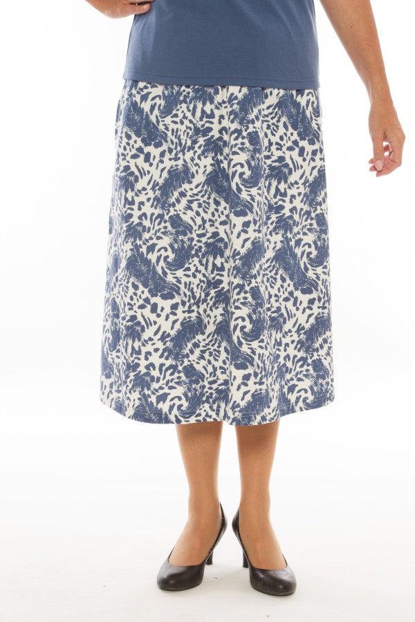 Two panel, A line jersey skirt for every occasion. Features distinctive fern print design, side pockets and easy fit stretch waistband. Made by Poppy to match with same colour products from the range. Machine washable.