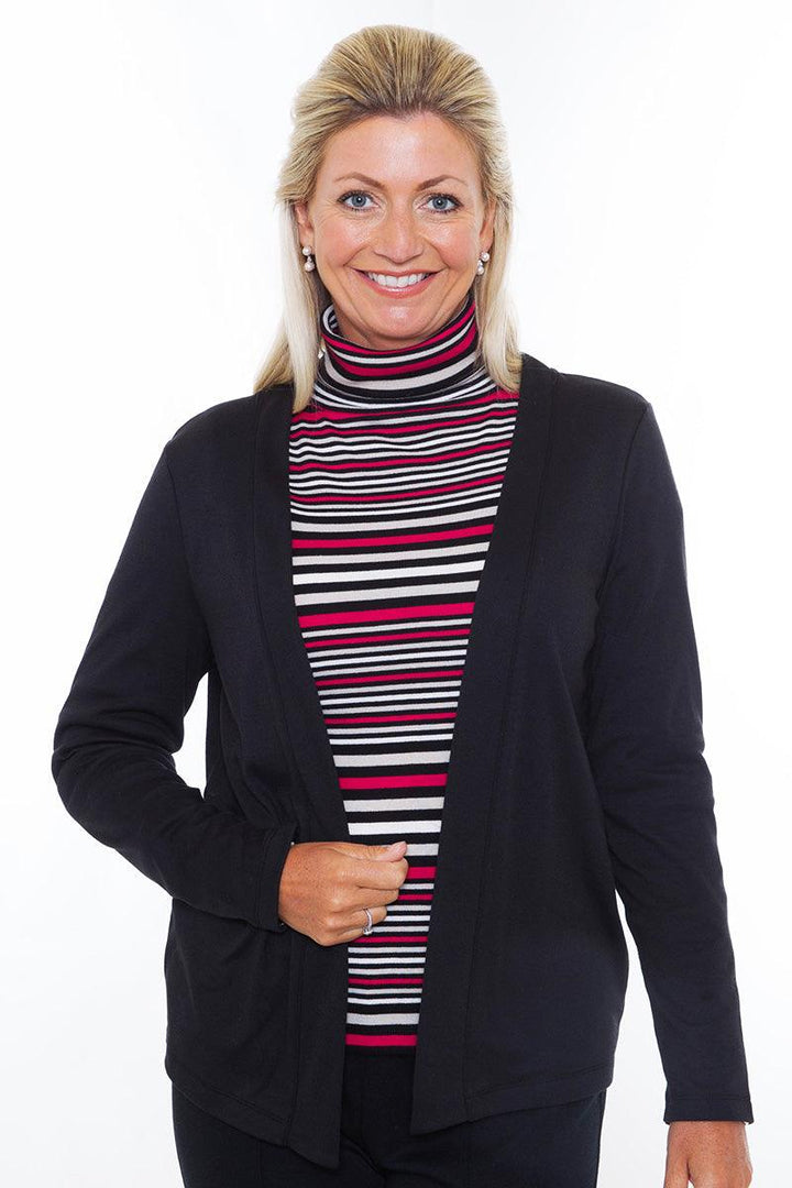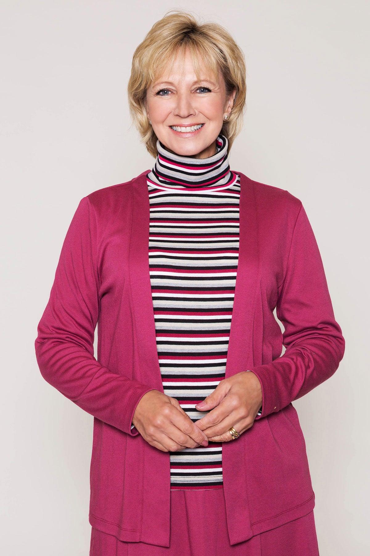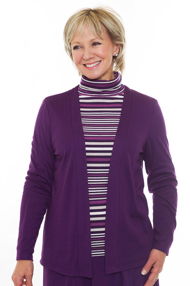 Versatile jersey cardigan style jacket by Poppy. Featuring long sleeves and edge to edge front. A modern, easy to wear option to mix and match with coordinating tops and skirts. Machine washable. 65% polyester, 35% cotton.