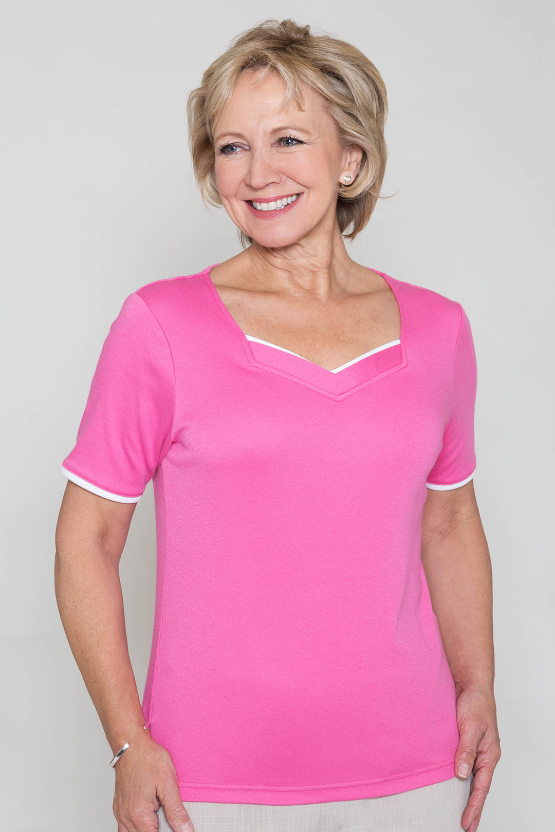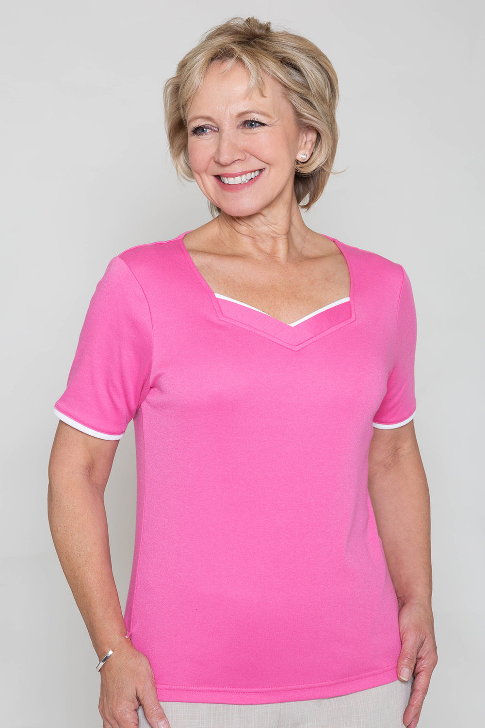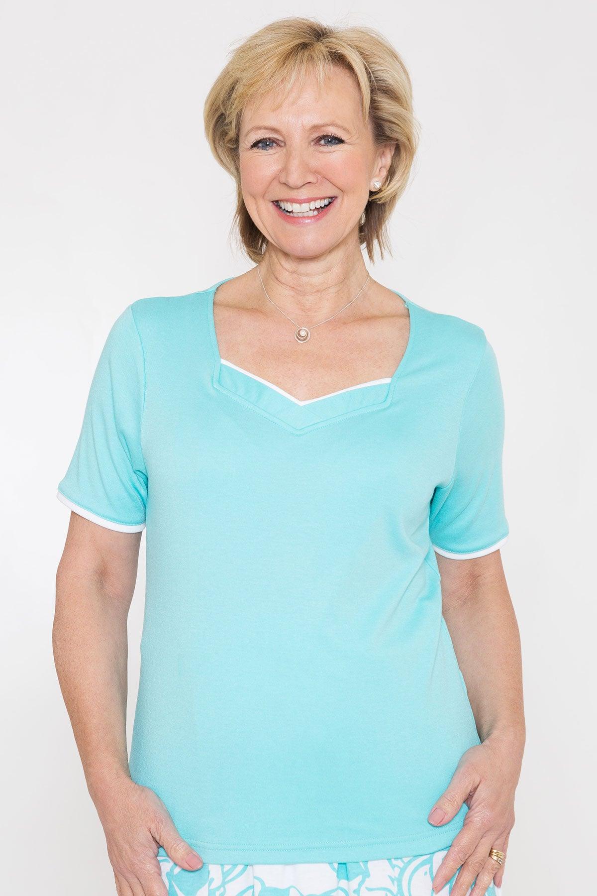 Attractive sweetheart V neckline top by Poppy. Made from a soft easy- wear jersey, it features short sleeves and contrasting white trim. Wear with coordinating separates from the new spring range. Back length from 23 inch. Machine washable. 65% polyester, 35% cotton.