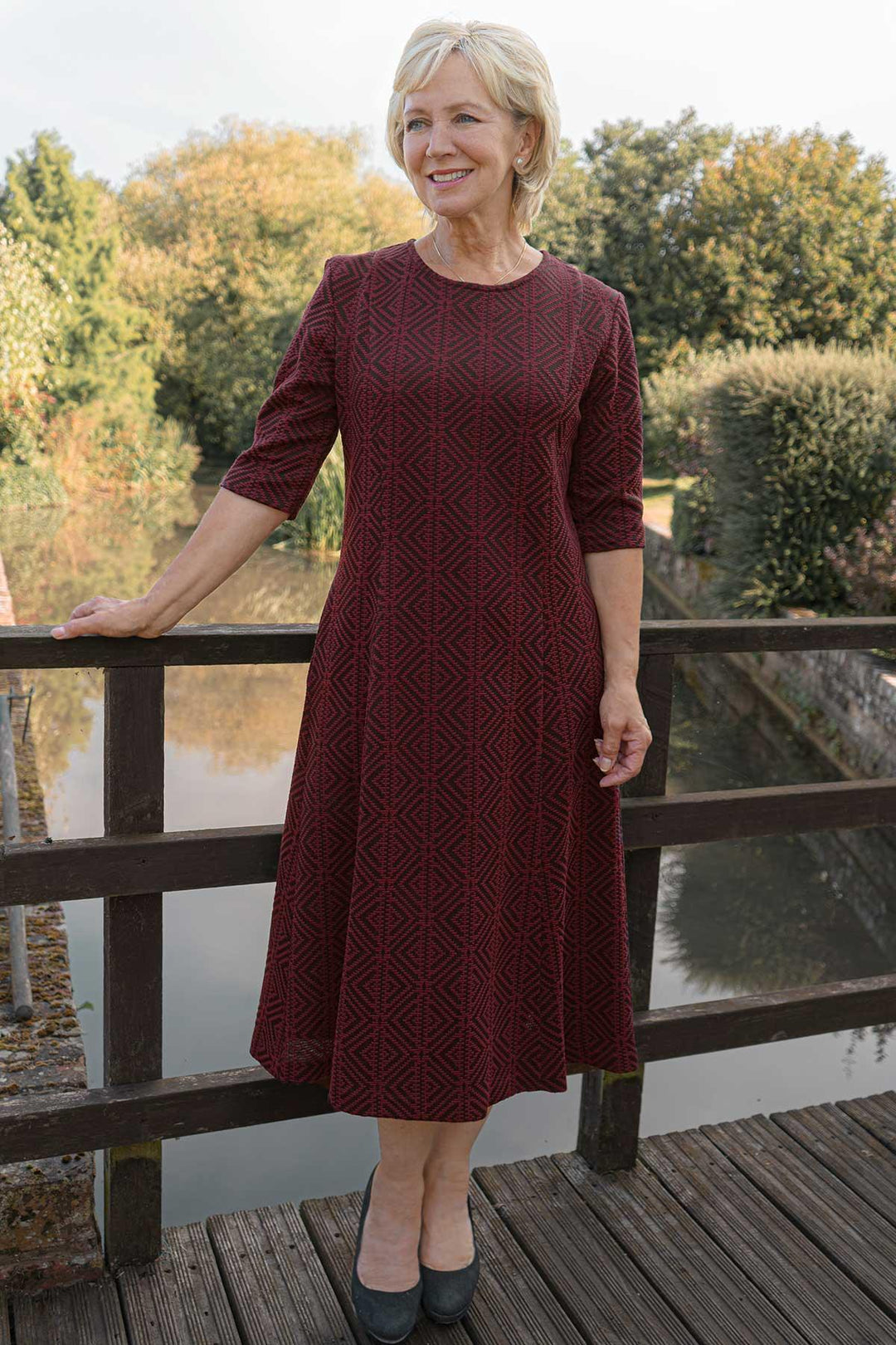 In a beautifully warm jacquard jersey material, this over the head style dress features a round neck and flattering princess lines. Concealed side pocket and three-quarter length sleeves, a relaxed fit for everyday wear. Designed in our Carr & Westley workrooms. Machine washable. 90% acrylic 9% polyester 1% elastane