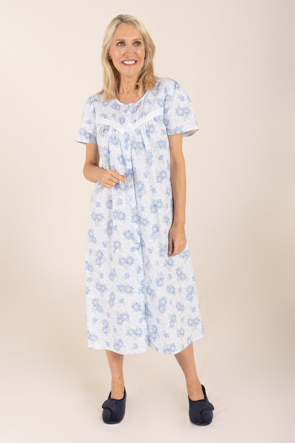 Traditional short sleeved nightdress, perfect to keep you cool this warm season. Featuring a buttoned down fastening with embroidered detailing to the front yoke and round neckline. Finished with pin tuck detailing and bow detail. Length 44”. Machine washable at 30. 100% cotton.