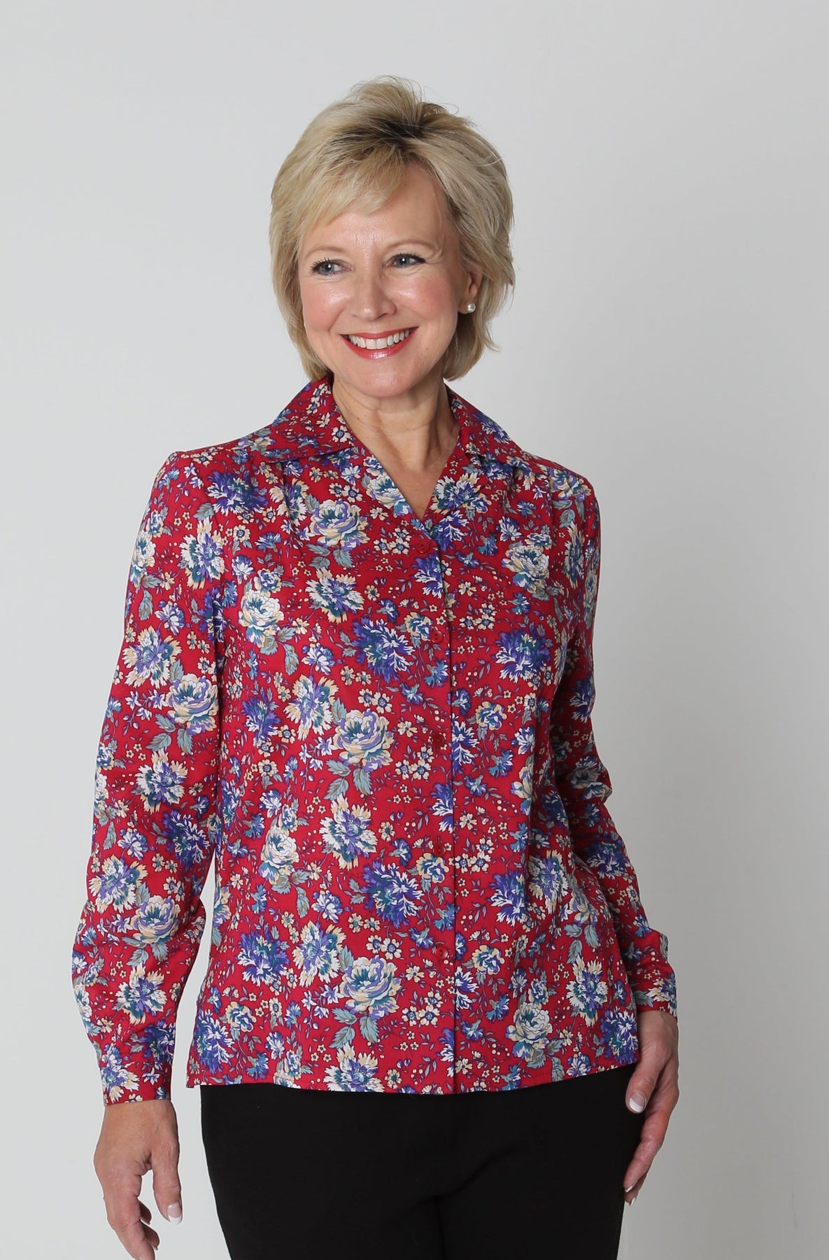 Long sleeve, V neck blouse in delightful rich red/floral print. Features smart Revers collar, side splits and button cuffs. Designed and made in our Kentish workrooms. Back length 25 inch. Machine washable. 100% cotton.