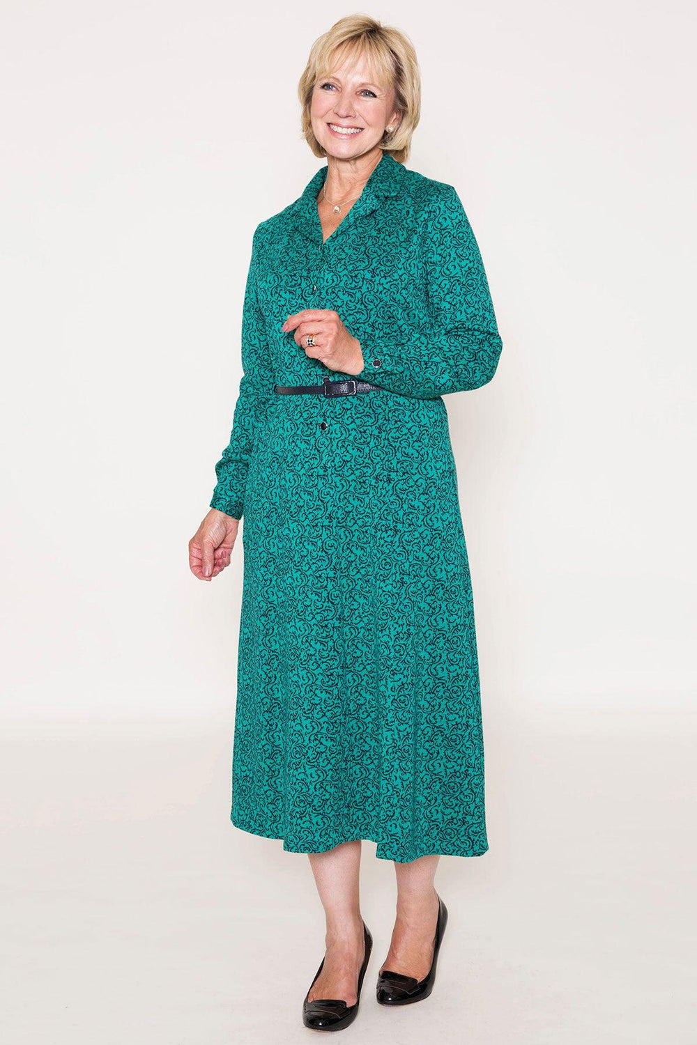 A Carr & Westley original princess-line dress designed and made in our Kent workrooms. Features stylish revers collar and three quarter button through front. Long sleeves with button cuff. Optional patent belt (no waist seams), matching buttons and concealed side pocket. Machine washable. 85% acrylic, 14% polyester, 1% elastane.