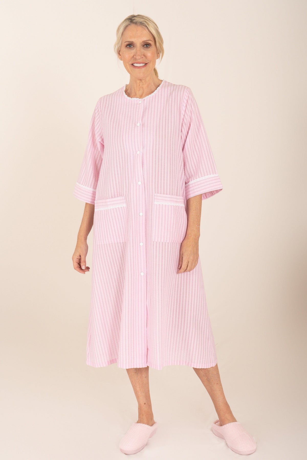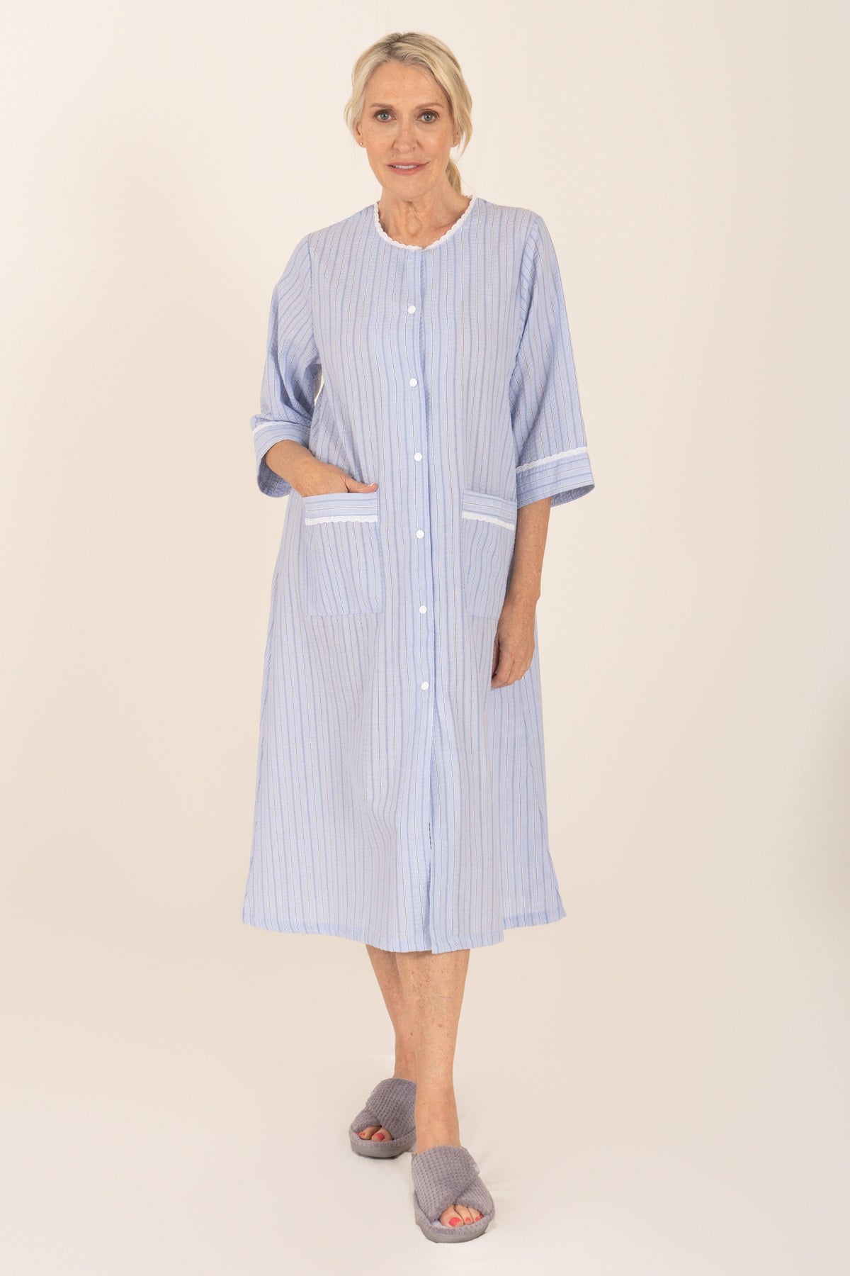 Indulge in the luxury of the Seersucker Housecoat. Designed with a round neck and seven popper front fastening for easier dressing.  The housecoat is finished with an elegant cotton embroidered trim to the neck, cuffs and two front patch pockets. Length 45”. Machine washable at 30. 55% cotton, 45% polyester.