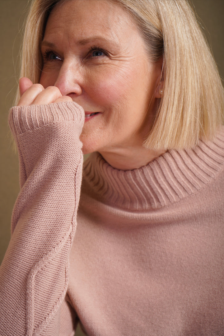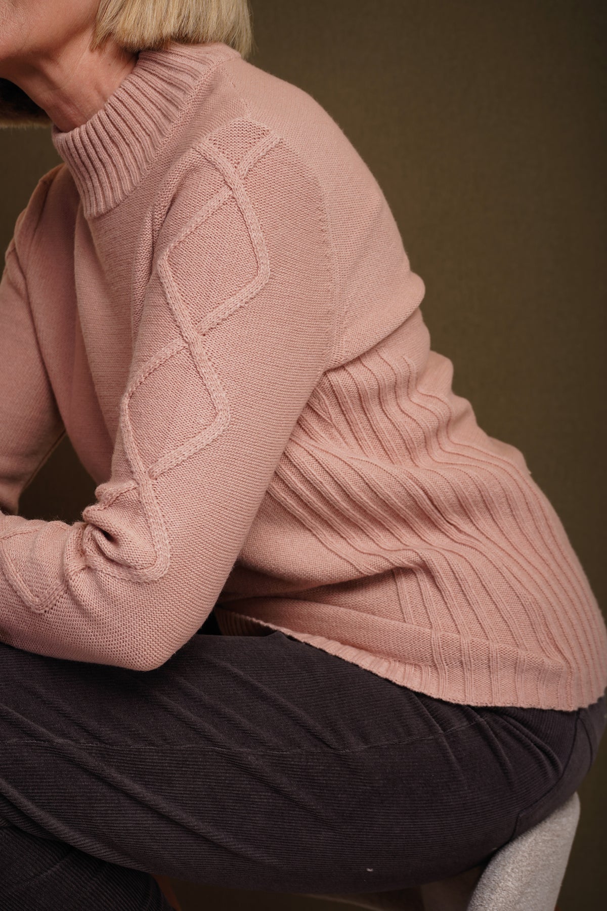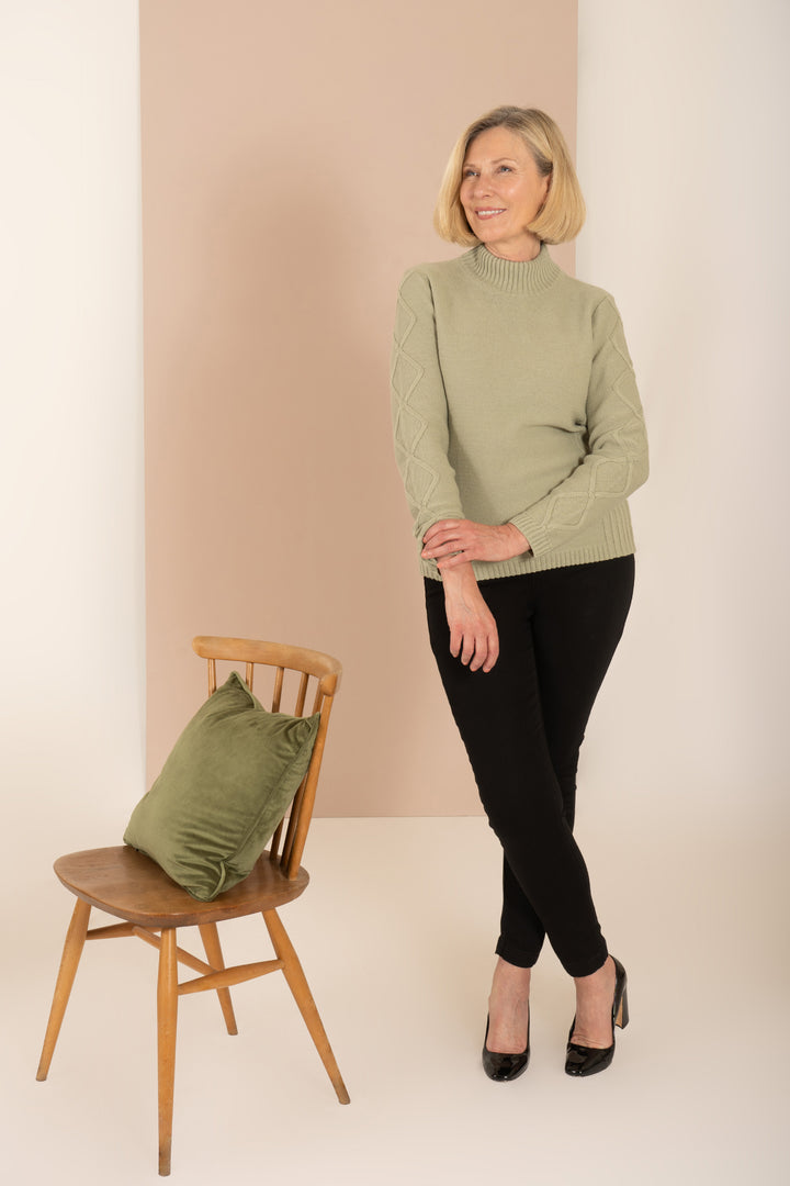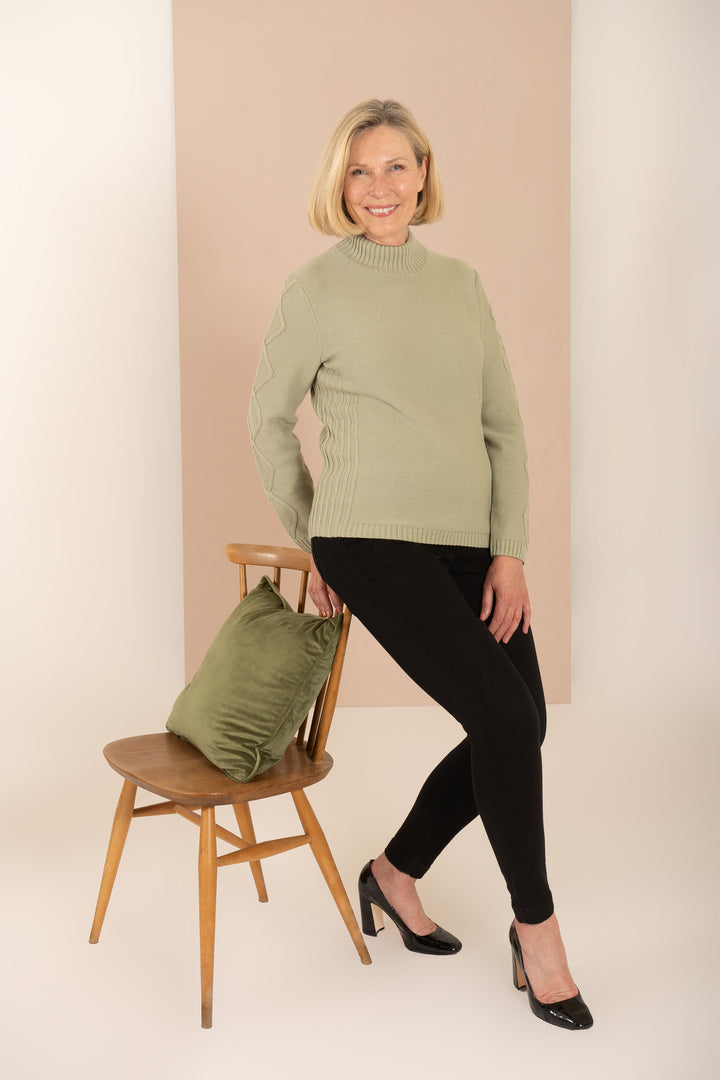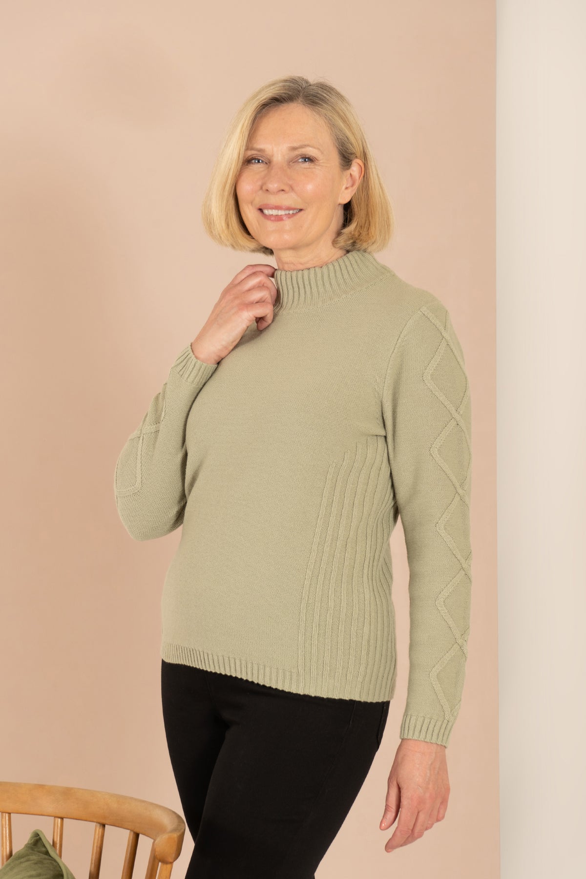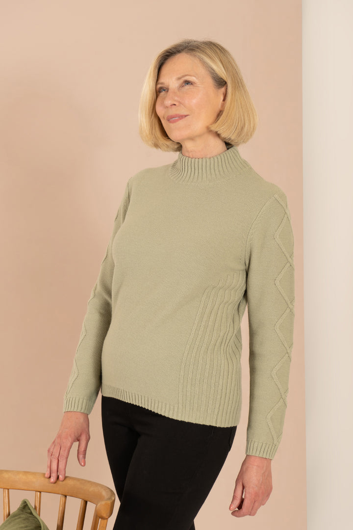 A traditional high neck knitted jumper, in a soft wool blend. A seasonal staple for your wardrobe this winter season. Featuring long sleeves with textured lattice cable detailing on the side. Finished with ribbed neckline, cuffs and hem. Machine washable at 30 degrees. Back length from 24”. 85% acrylic, 15% wool.