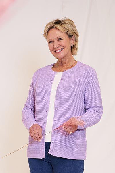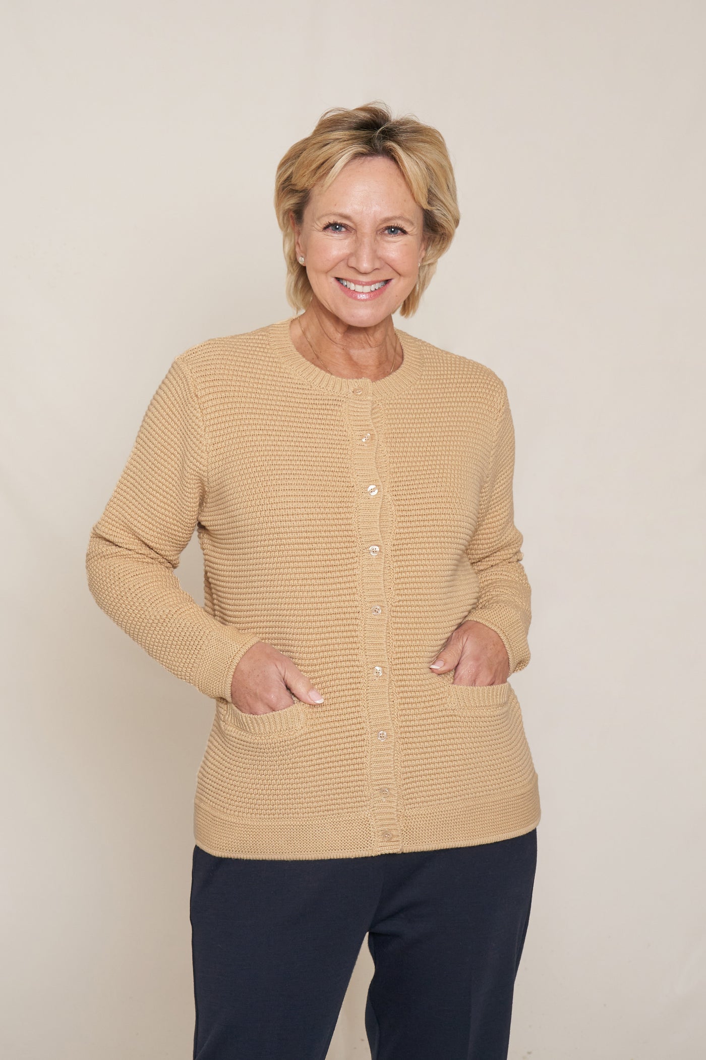 Knitted from a cotton blend for a soft and reliably hard-wearing textured cardigan. Crew neck, tonal button fastening at front, and two front pockets. Back length from 24”. 55% acrylic, 45% cotton. Made by Poppy.