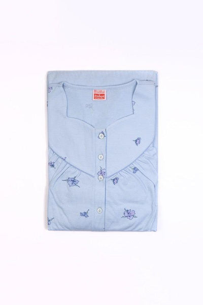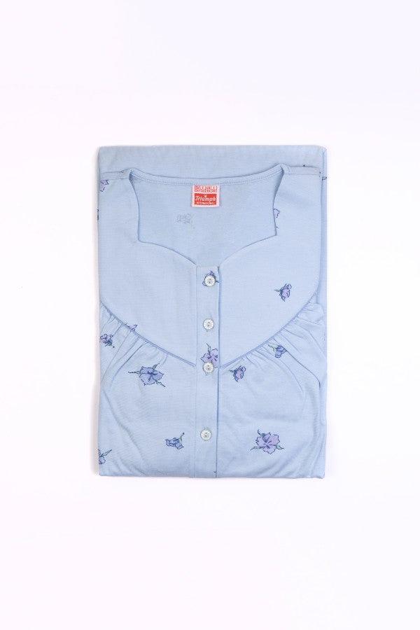 Gorgeous blue short sleeved nightdress with floral pattern. Features a button down fastening and elegant neckline. Machine washable. 100% cotton jersey. Made by Triumph.