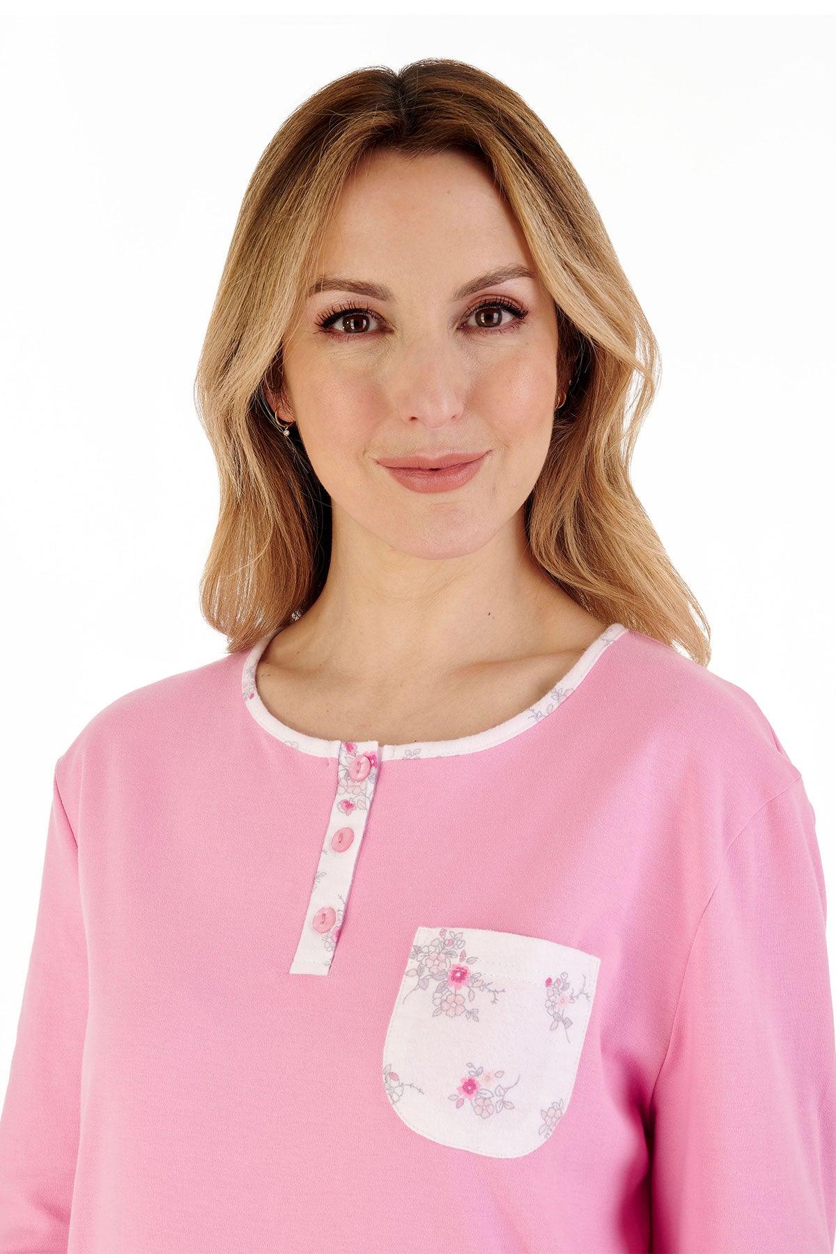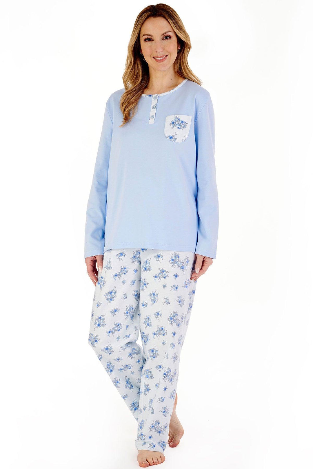 Designed in a modern style, this woven pyjama set features a long sleeved plain interlock top, with a round neckline finished with contrasting trims, three-button placket and a breast pocket. Coordinating floral print, fully elasticated trouser designed in cotton flannel fabric. Back length from 25” / inside leg 29”. Machine washable. 100% cotton. Made by Slenderella.