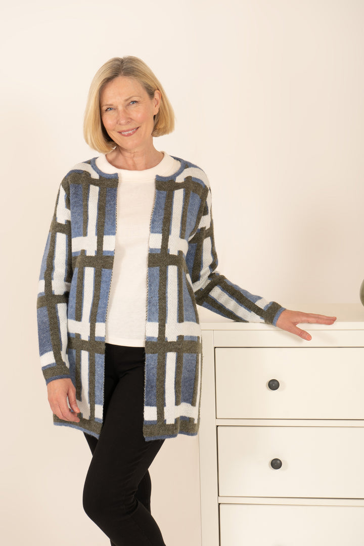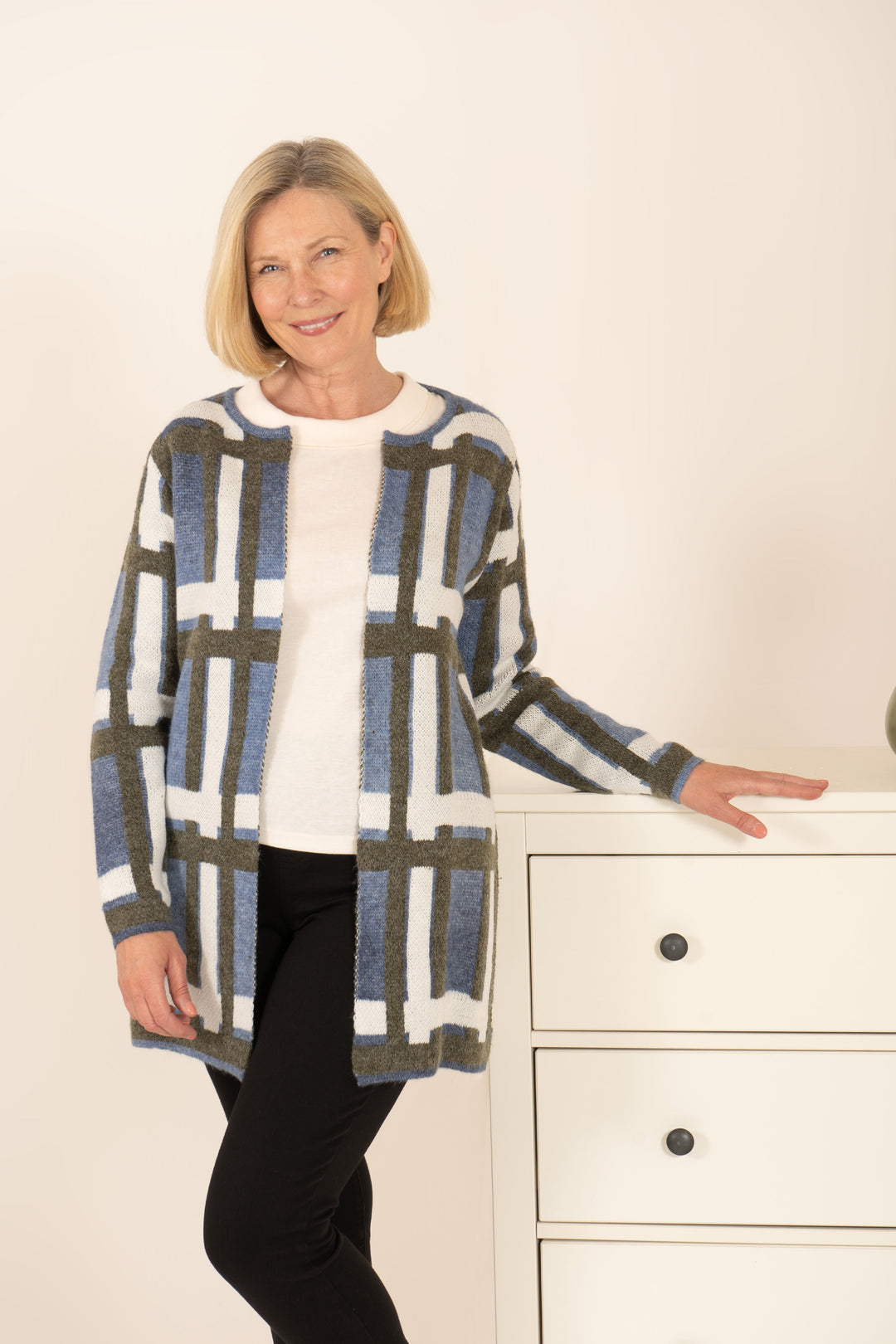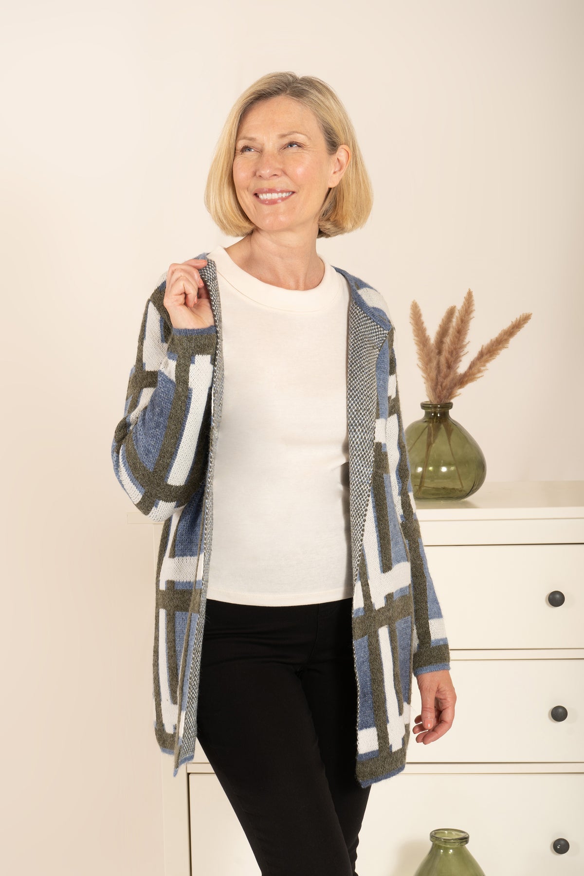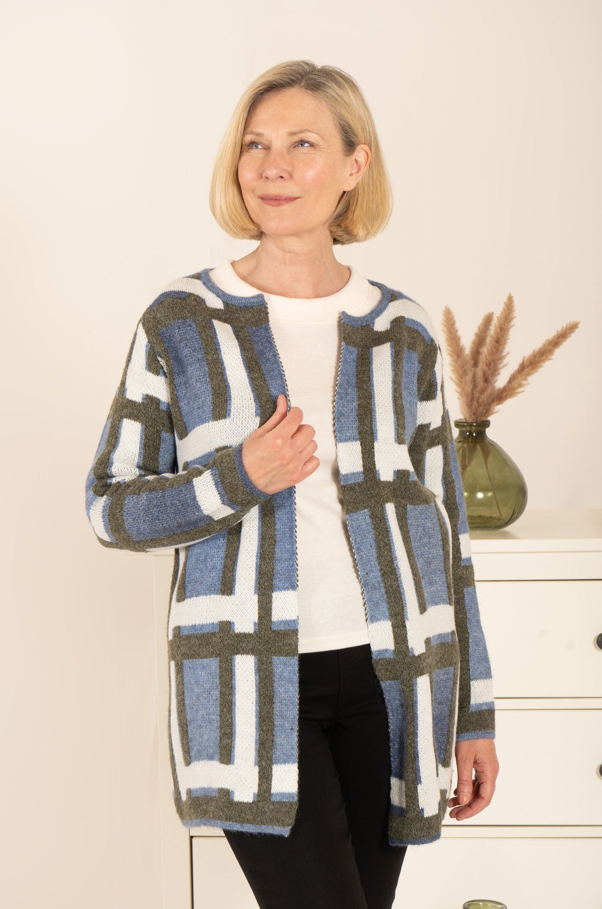 A signature piece from Claudia.C. This versatile knitted cardigan features an all-over geometric style print, making it an effortless everyday option for wearing over t-shirts and light jumpers. Featuring a round neckline and long sleeves. Finished with ribbed detailing on the cuff and neckline. Machine washable at 30. 75% acrylic, 19% polyamide, 6% polyester. Back length from 30”.
