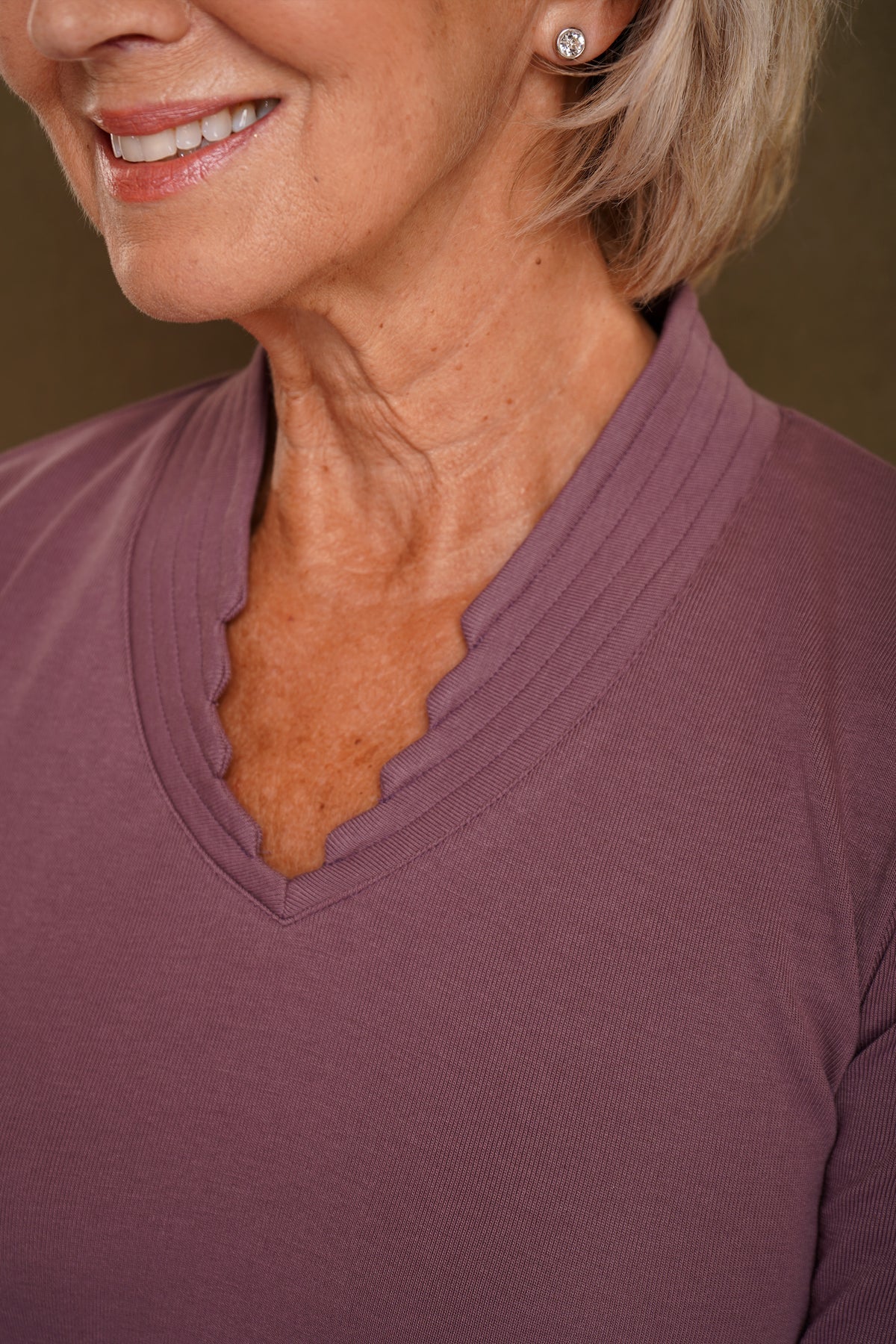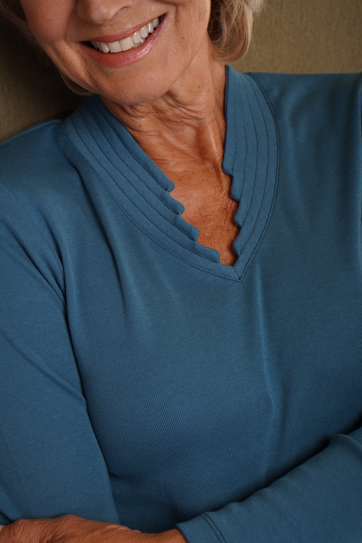 A truly versatile, everyday wear top now in long sleeves. Features a delightful stepped neckline design for a feminine touch. Made from Poppy's famous super soft, super smooth jersey fabric that contours your figure beautifully. Finished with comfort side splits for a fitted, relaxed look. Back length from 23”. 65% polyester, 35% cotton.