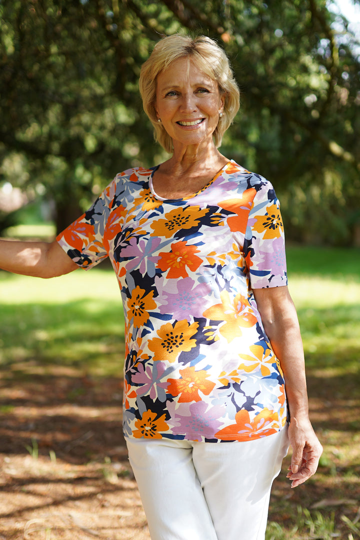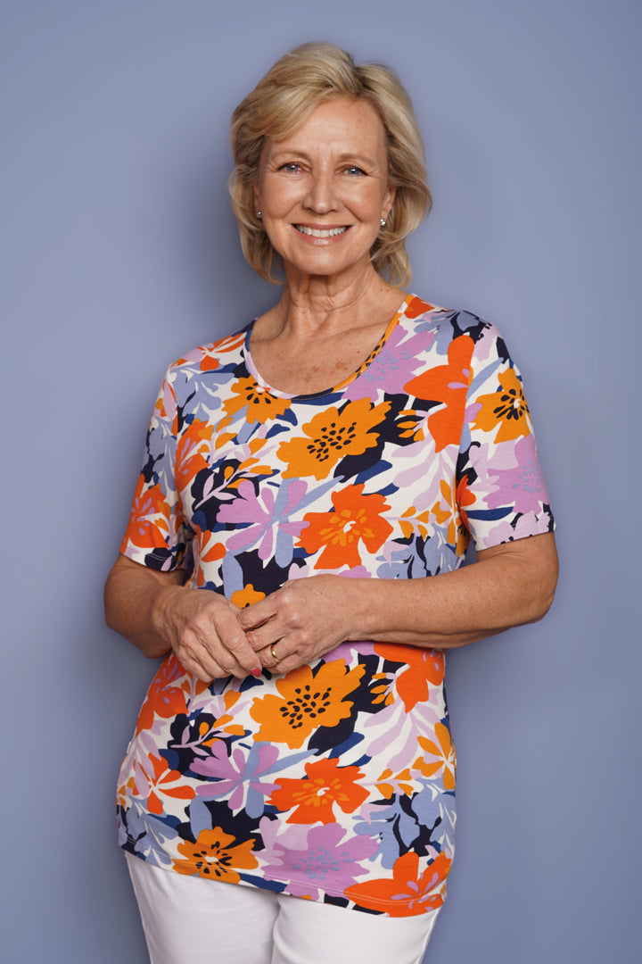 Introducing the Sunset Floral Top, meticulously designed using a luxurious blend of viscose and elastane fabrics. This top showcases a striking all-over floral pattern and a timeless, classic round neckline, exuding an enduring and refined sense of style. Its soft and velvety texture will provide a comfortable addition to your wardrobe. Back length from 23”. Machine washable at 30 degrees. 95% viscose, 5% elastane.