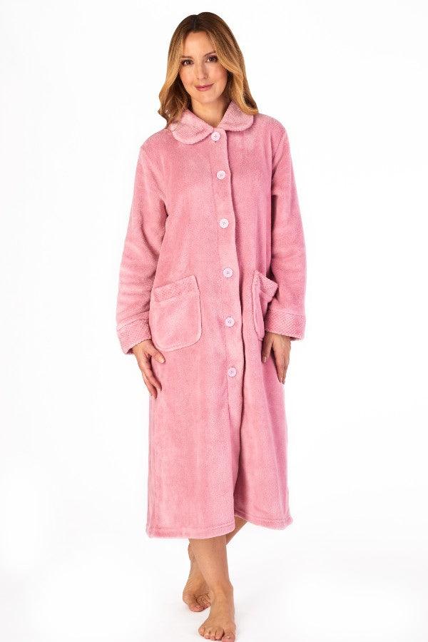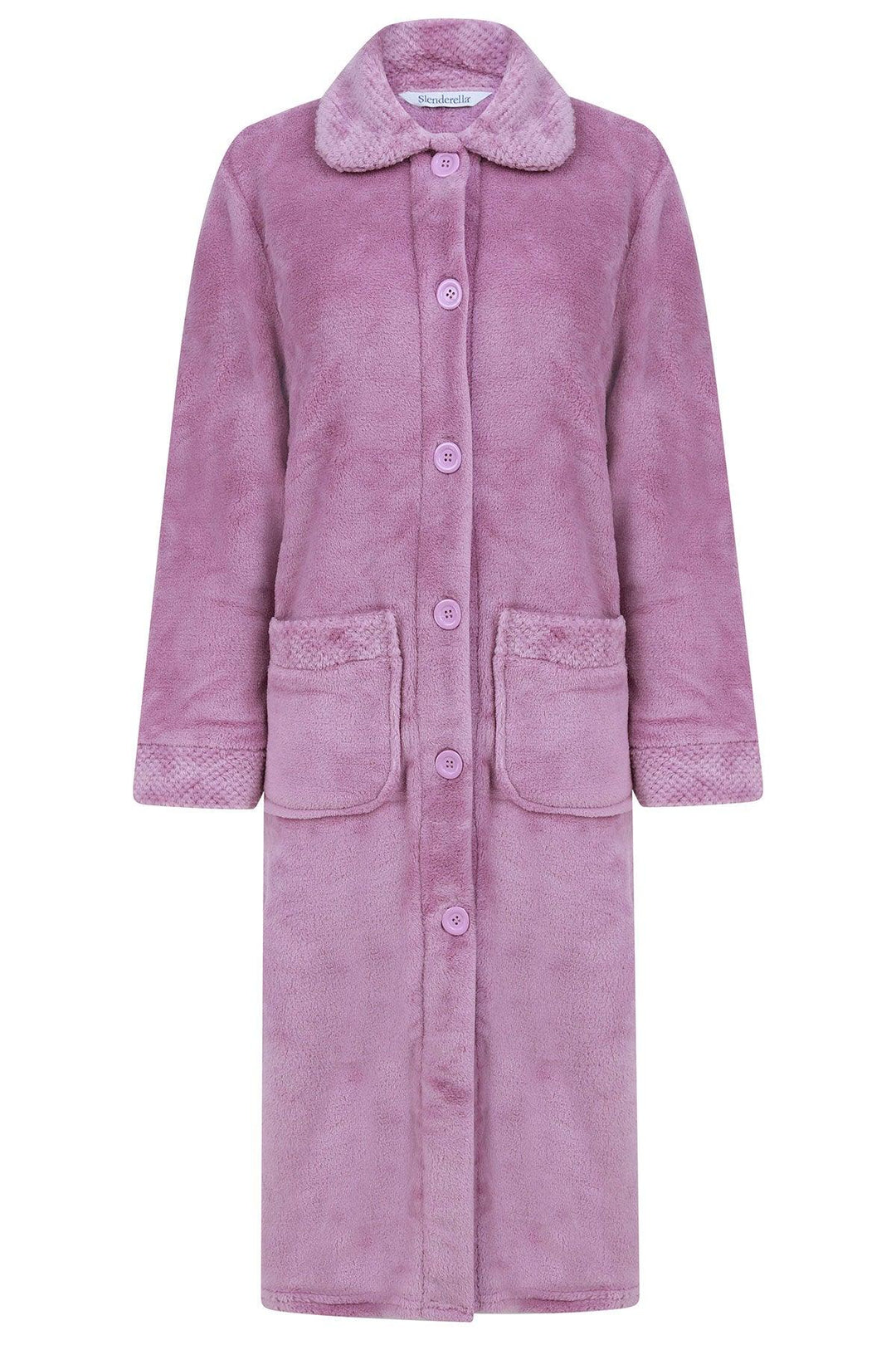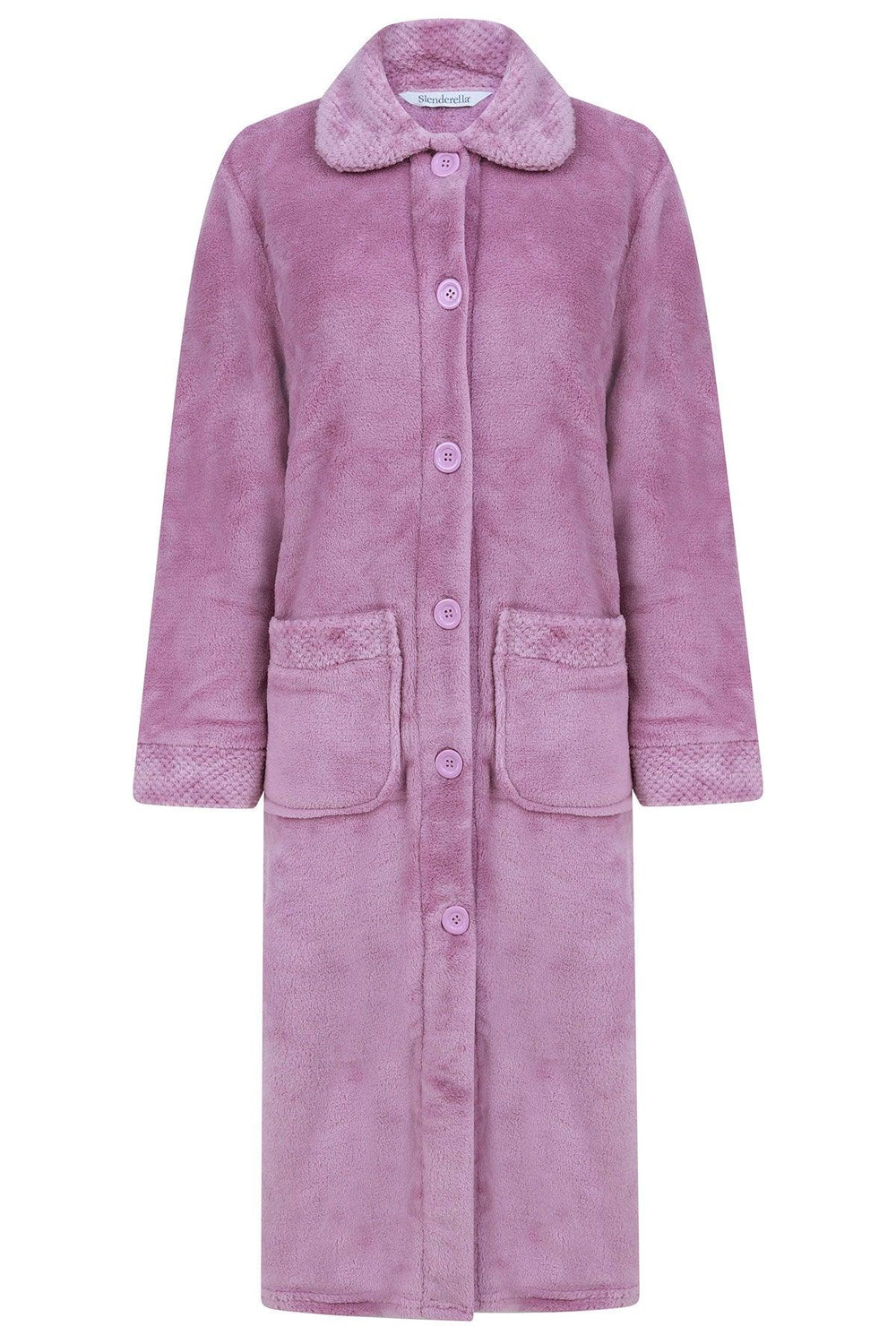 Classic button-through, super-soft dressing gown from Slenderella. Neat top stitching finishes Peter Pan collar, cuffs and two patch pockets. Button to neck fastening. Warm lightweight polar fleece fabric. Back length from 46”. 100% polyester.