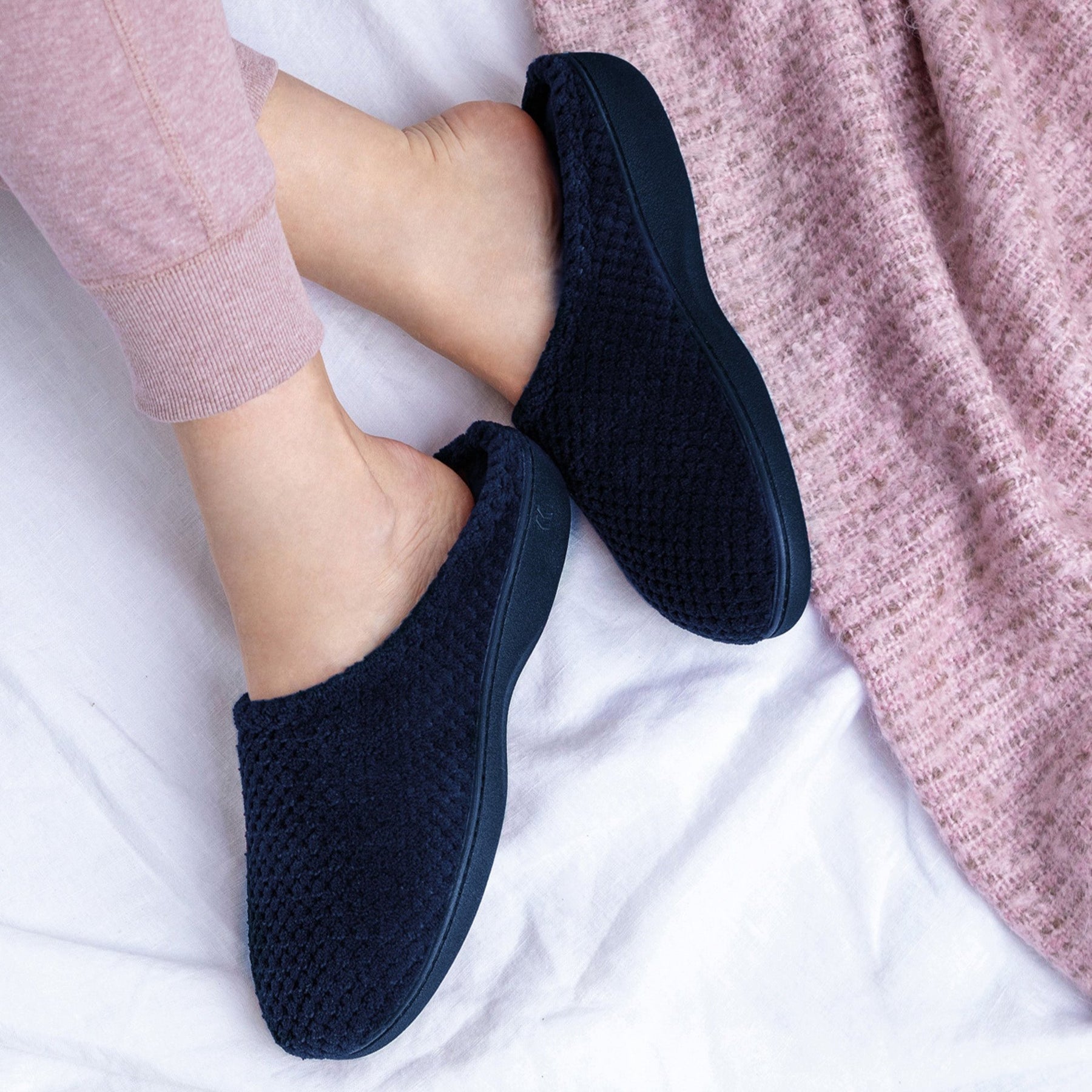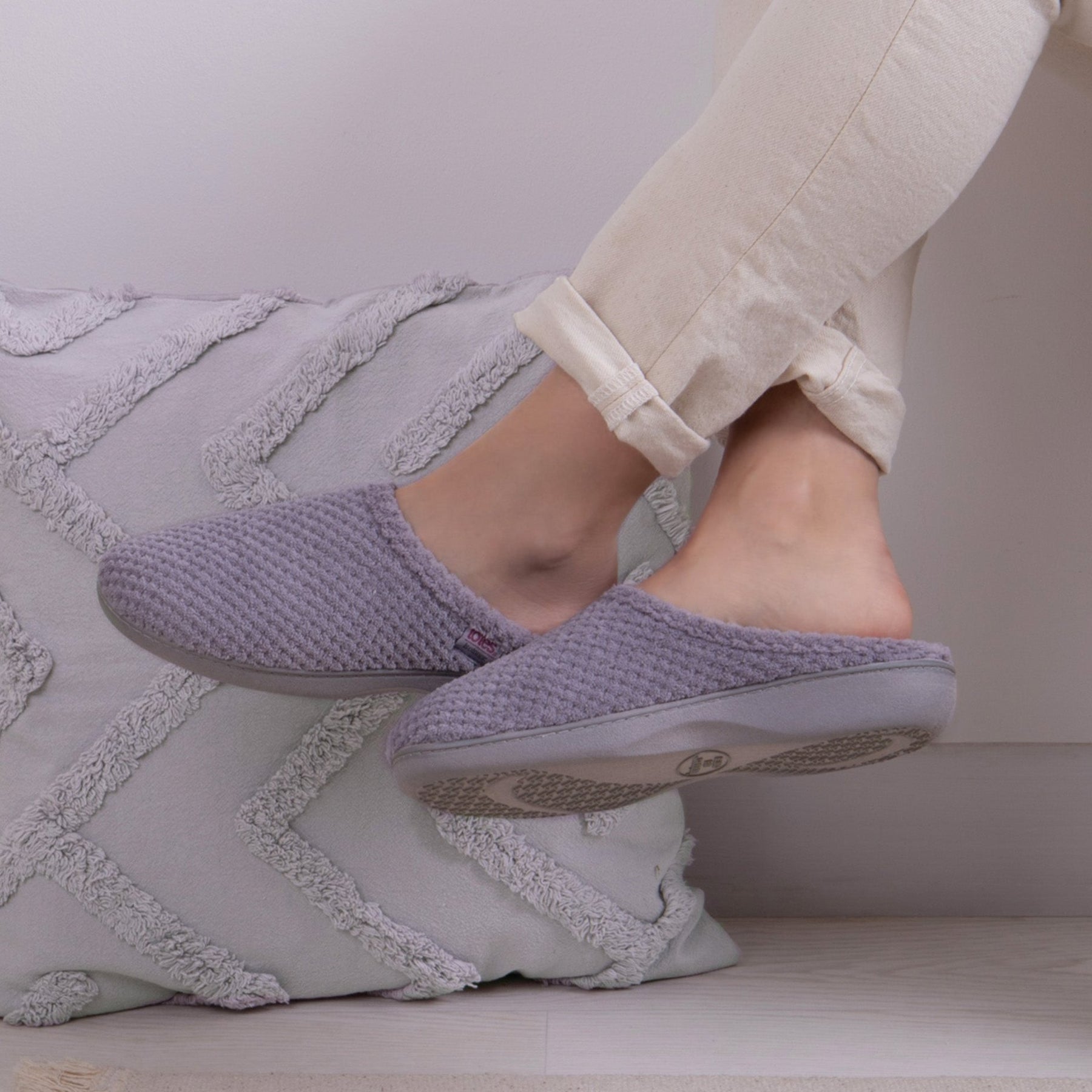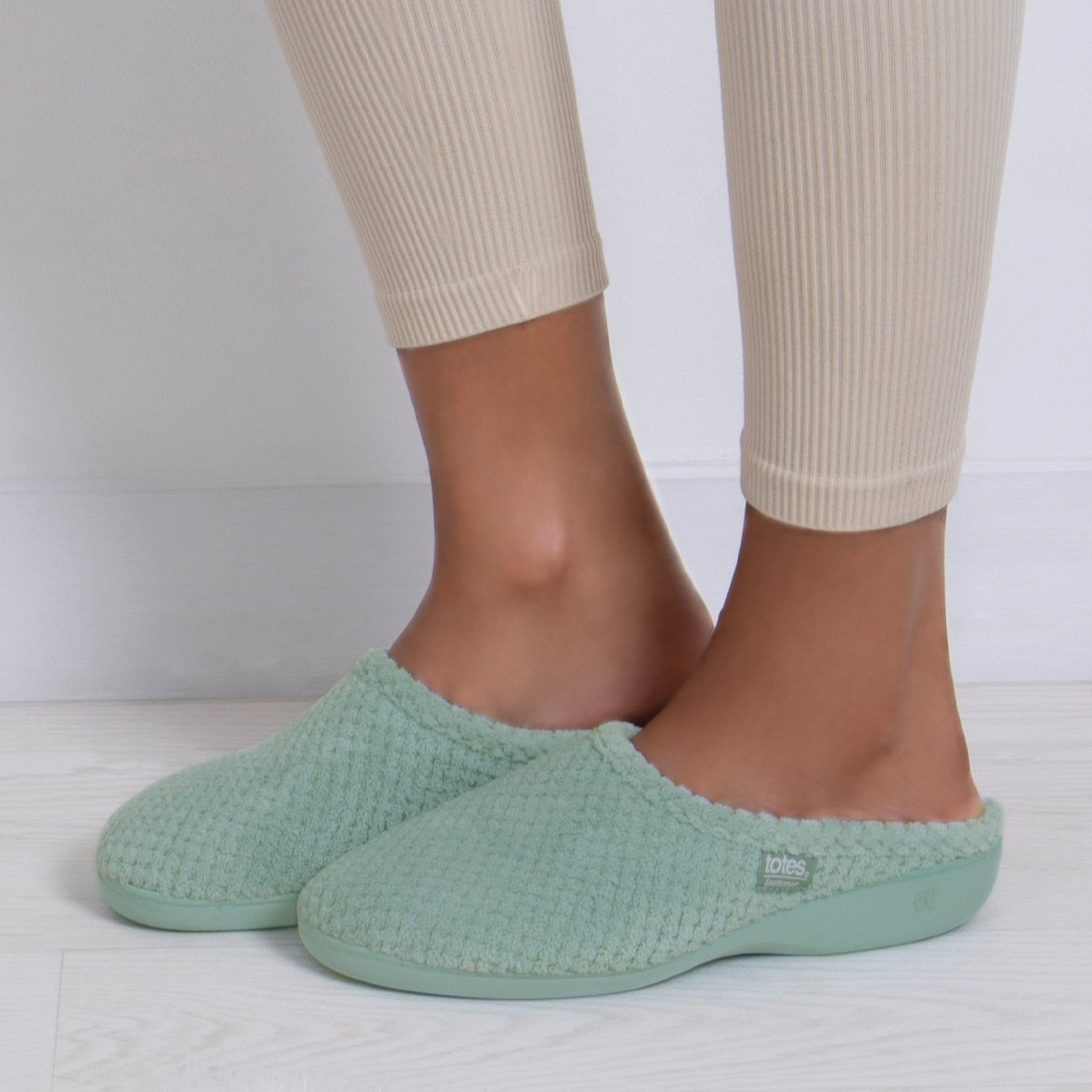 Textured popcorn mule with 360 surround comfort memory foam layer for a customised fit. Unique Pillow Step insole for underfoot cushioning. Heel and arch foam for added support. Made by Totes Isotoner.