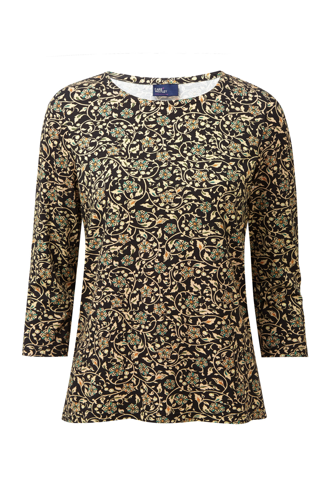 A new, three quarter sleeved jersey top from C&W’s seamstresses. Featuring a trellis leaf print design, it is a perfect addition to your winter wardrobe. Round neckline and comfort side splits. Back length from 23 inch. Machine washable. 94% viscose, 6% lycra.