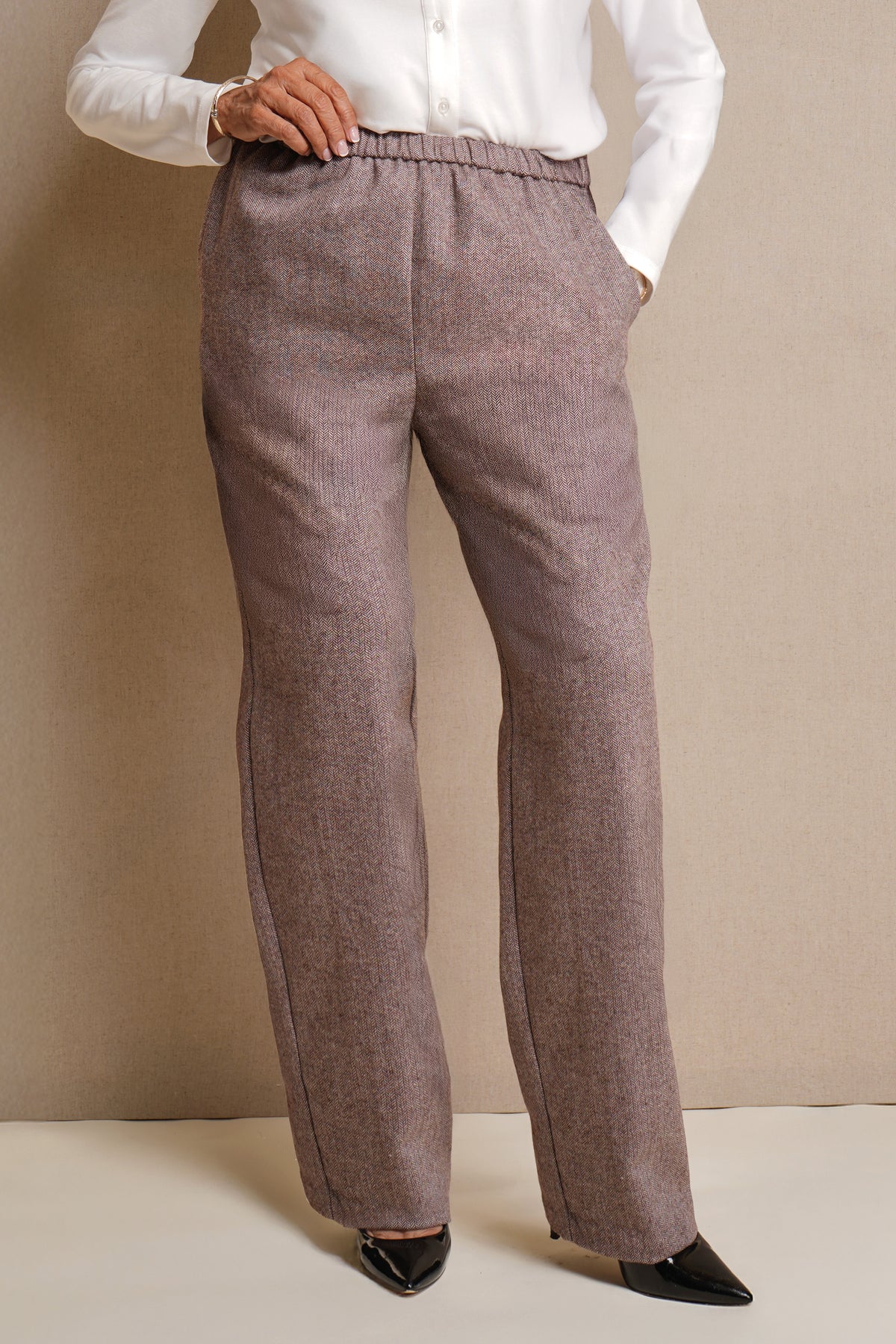 These tweed trousers combine classic style with modern comfort, featuring a refined herringbone pattern for a timeless appeal. The elasticated waistband ensures a perfect fit, while two side pockets offer practicality without compromising the smart silhouette. Ideal for sophisticated occasions, they effortlessly elevate any ensemble. Machine washable at 30 degrees. 50% polyester, 50% wool.