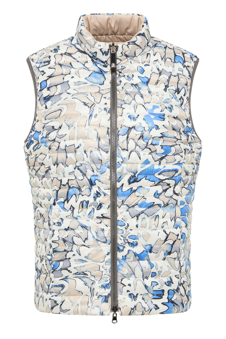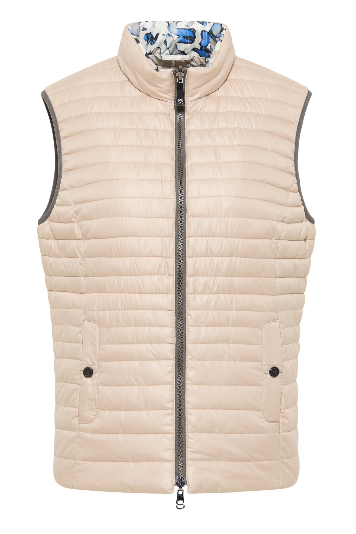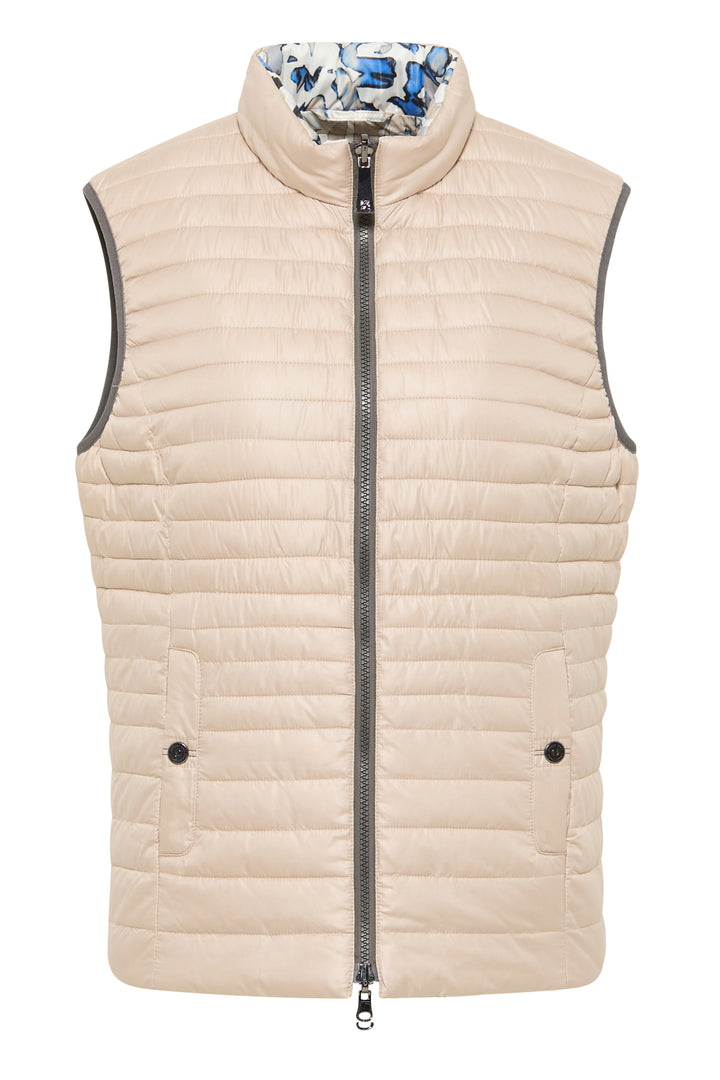 Adding a splash of colour to your wardrobe, this reversible gilet will have you looking stylish no matter which side you choose. Comfortably quilted, it features one side in cream and the other in an all-over blue print. With a zip fastening and side pockets with popper button fastening, it's perfect for summer strolls. Back length from 23”. Machine washable at 30. 100% polyester.