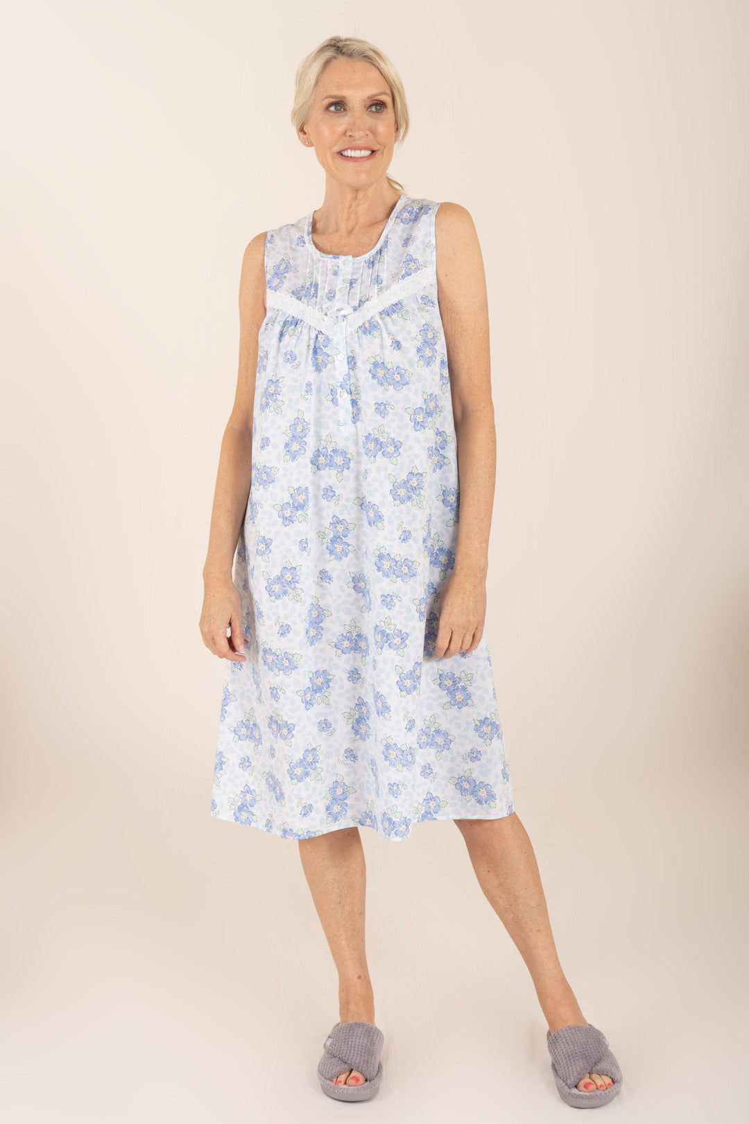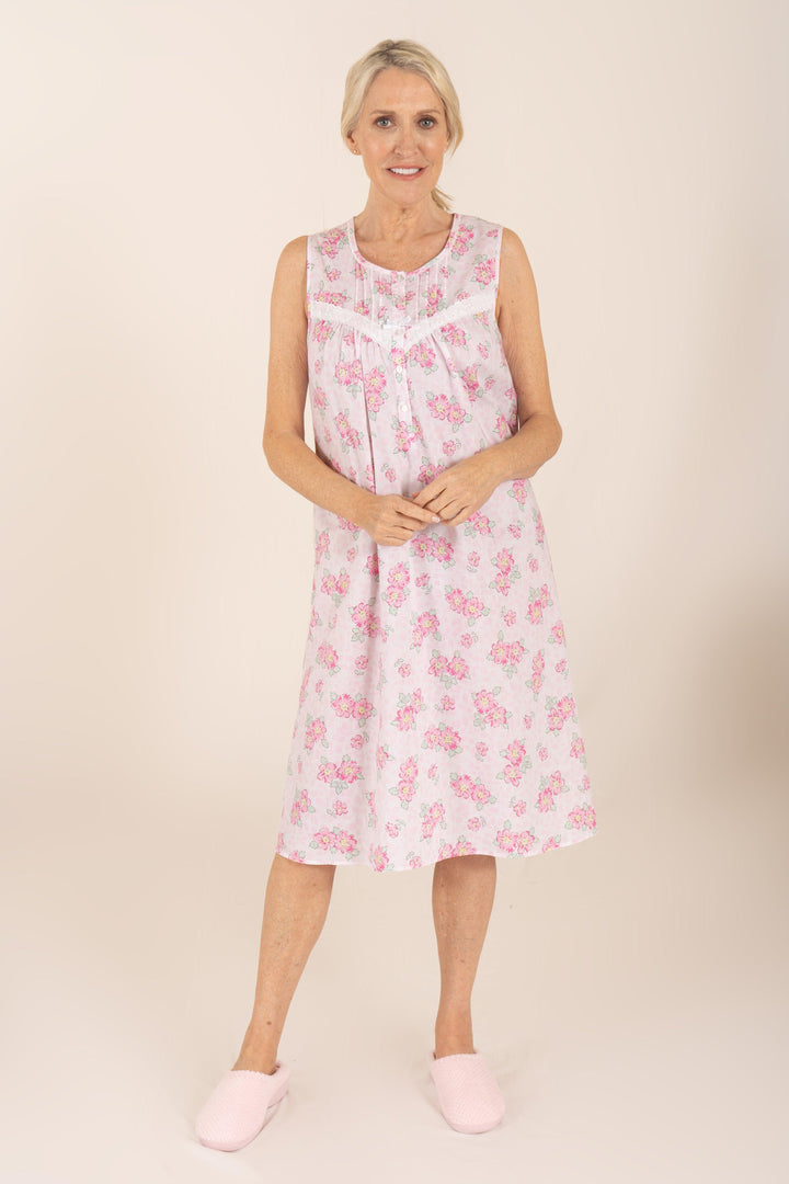 A traditional sleeveless cotton nightdress in an all-over floral print. Featuring embroidered detailing to the front yoke and a five button placket to provide ease when dressing. Finished with pin tuck detailing and bow detail. Length 41”. 100% cotton.