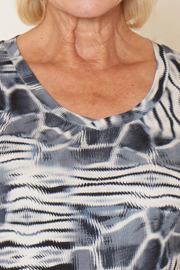 Modern abstract wave print top with flattering crossover v-neckline with subtle gathering. Back length from 22”. 96% Viscose and 4% elastane. Made by Lebek.